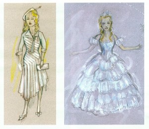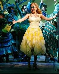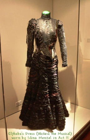 Ma non si può non parlare delle due protagoniste. Glinda si prende molta cura di sé e dei suoi abiti, presentandosi però sempre molto elegante, sia negli abiti collegiali bianchi che sfoggia a scuola, sia negli abiti lunghi di un azzurro quasi bianco che indossa una volta entrata al servizio del Mago di Oz. E non può mancare un abito vaporoso, con una gonna che sembra realizzata con petali di fiori, con tanto di coroncina e scettro, che ricorda vagamente quello del film del 1939. Invece Elphaba, ovviamente, è perennemente in nero. Finchè è a scuola appare ovviamente trasandata, perché della sua immagine non le importa niente, ma da adulta la vediamo con un abito nero di cui, se osservato bene, si nota il particolare taglio, con piccole balze e mille inserti. E non può mancare il capello da strega a punta, che agli occhi di tutti appare ridicolo, ma che lei non si toglierà mai.