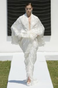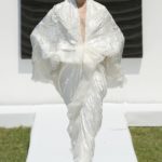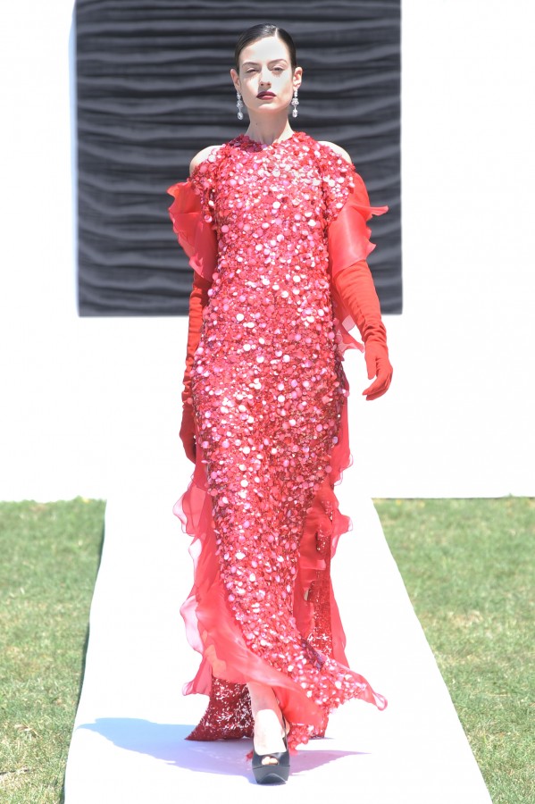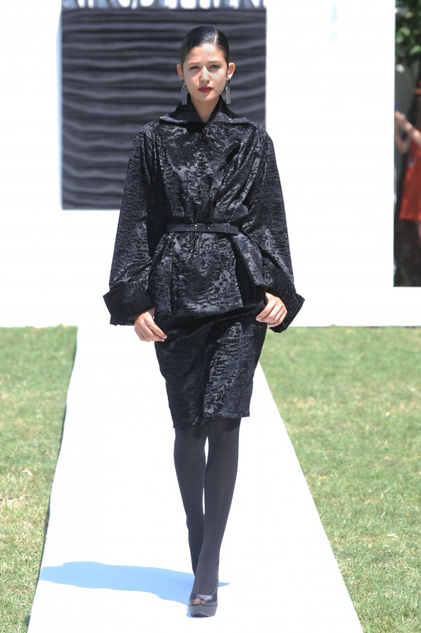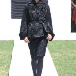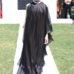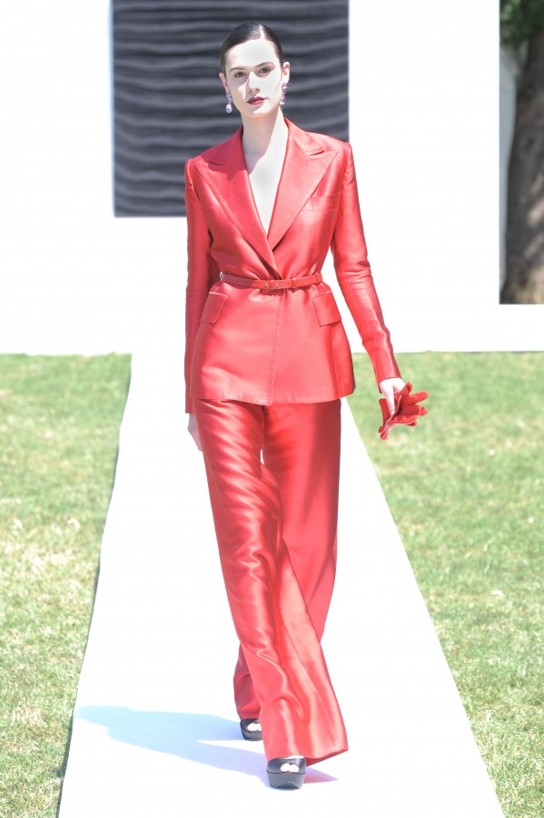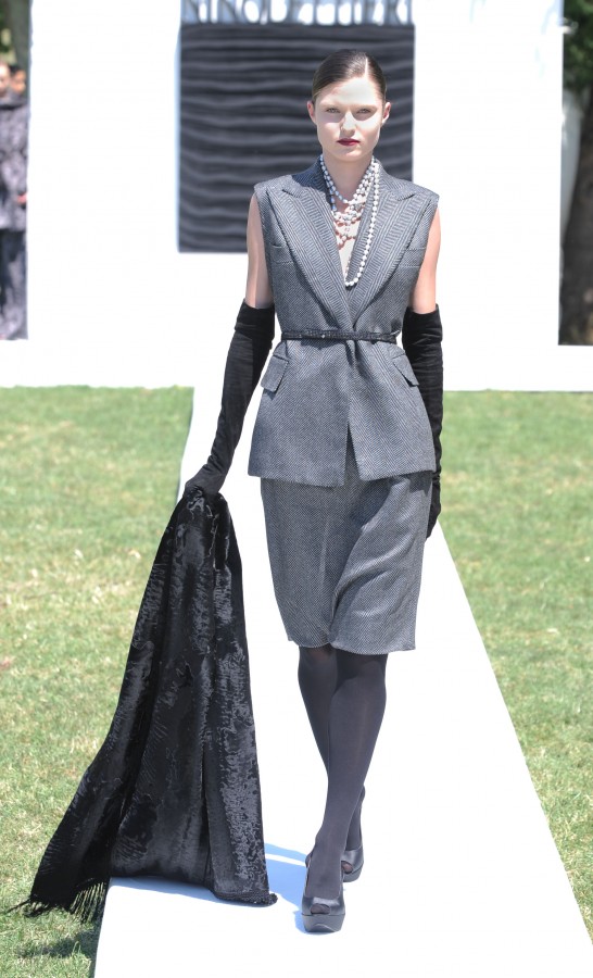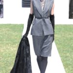 D’altro canto, l’arte fotografica di Helmut Newton rivive in passerella, definendo una concezione della femminilità sexy e al contempo androgina. Sfila una donna forte, dalla bellezza insolita e attenta al dettaglio, simile a quella rappresentata negli scatti del grande maestro della fotografia. La scelta è evidente nel completo due pezzi grigio con gonna sagomata al ginocchio e giacca smanicata con punto vita in evidenza, l’effetto è reso ancora più significativo dall’abbinamento con guanti neri lunghi al gomito.