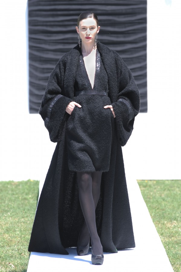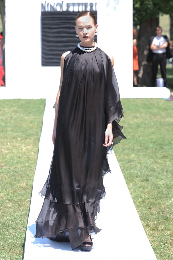 Le creazioni di Nino Lettieri, per la prossima stagione fredda, hanno conquistato il pubblico presente. La collezione basata sul gioco fra volumi fluidi e geometrie è dedicata a due protagonisti della creatività internazionale del XX secolo. Paul Poiret, grande innovatore e figura di primo piano della moda della Belle Époque, ha ispirato le linee morbide ed eleganti dell’abito con volants in soffice organza, della creazione in mikado rosso ricamato con piccoli cristalli neri e dell’abito in prezioso pizzo nero. La bellezza naturale del corpo femminile emerge prepotentemente rivalutata, dalla liberazione dalle costrizioni imposte da busti e corsetti.