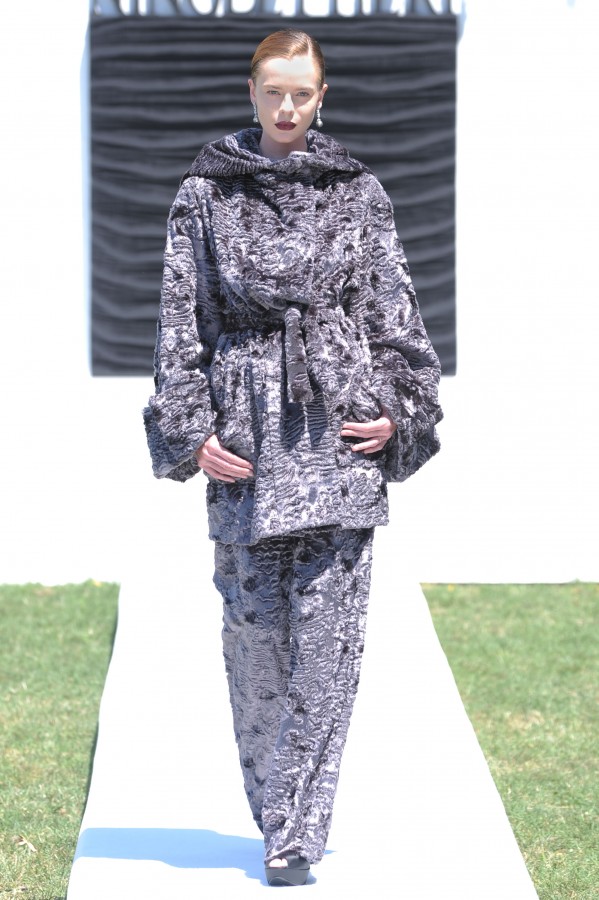 I soprabiti in alpaca, cashmere e astrakan scelgono grandi volumi per suggerire portabilità ed eleganza. I tailleurs uniscono pantaloni a palazzo e giacche in doppio petto dalle linee maschili, sono stati realizzati in collaborazione con il maestro Luigi Dal Cuore in morbido cashmere spigato grigio o in mikado rosso dai toni intensi.